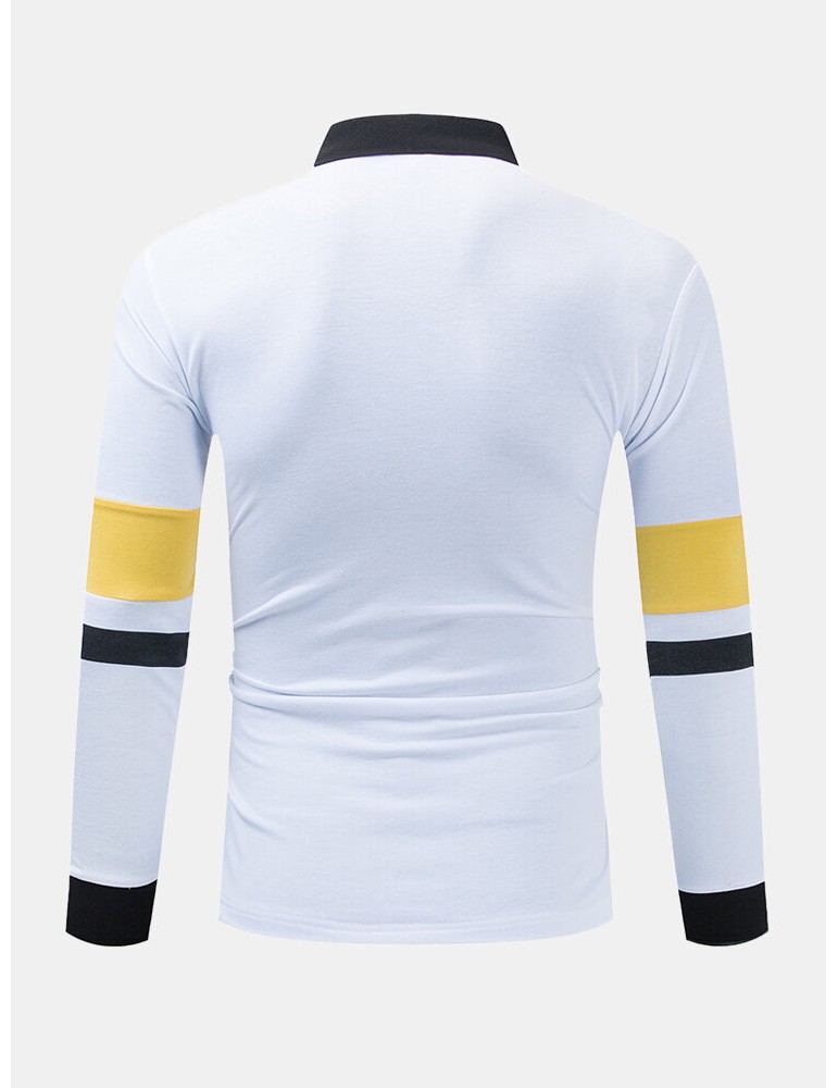 Golf Shirts - Mens Contrast Patchwork Letter Print 100% Cotton Casual Long Sleeve Golf Shirts