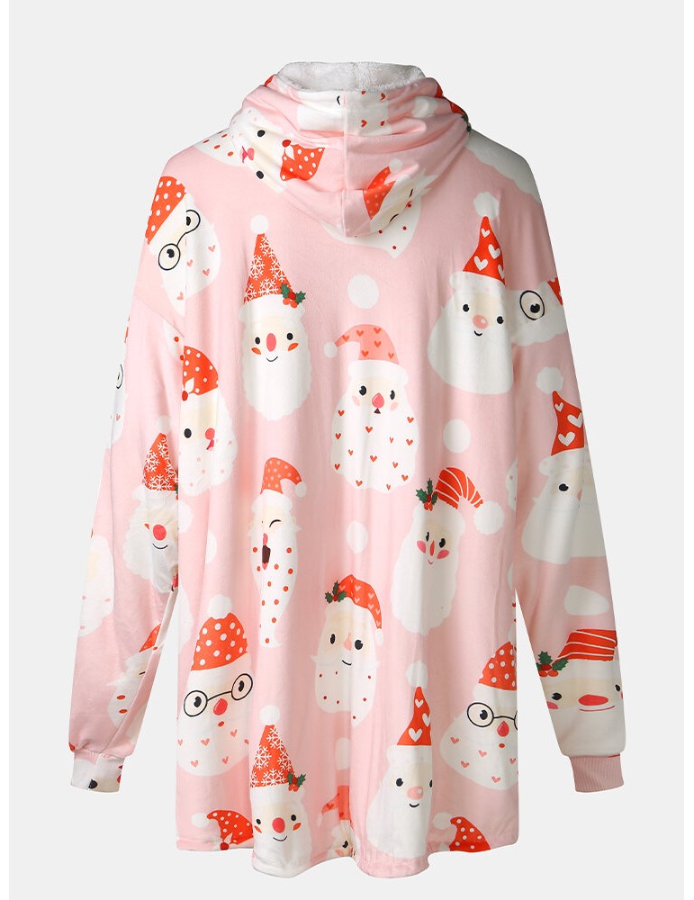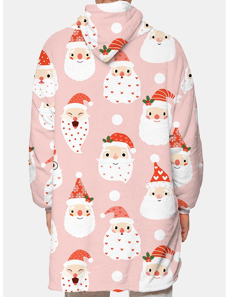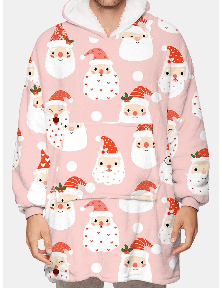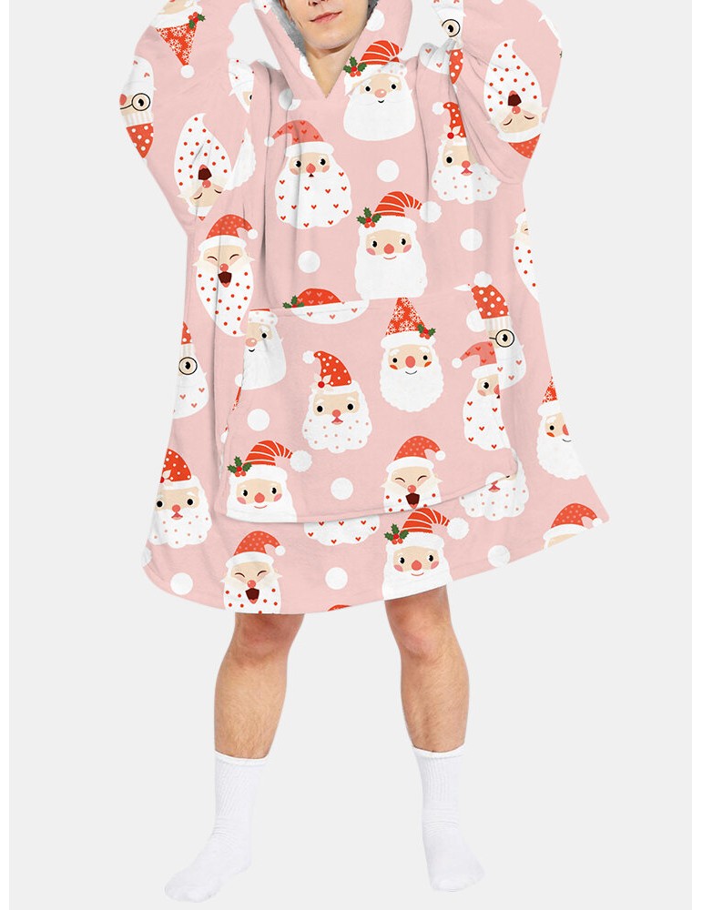 Robes - Mens Christmas Cartoon Santa Claus Print Thick Fleece Lined Reversible Home Blanket Hoodie