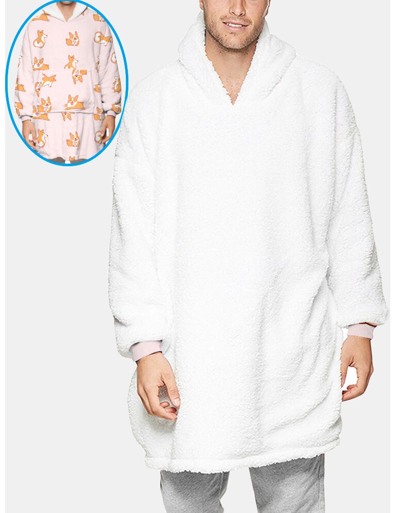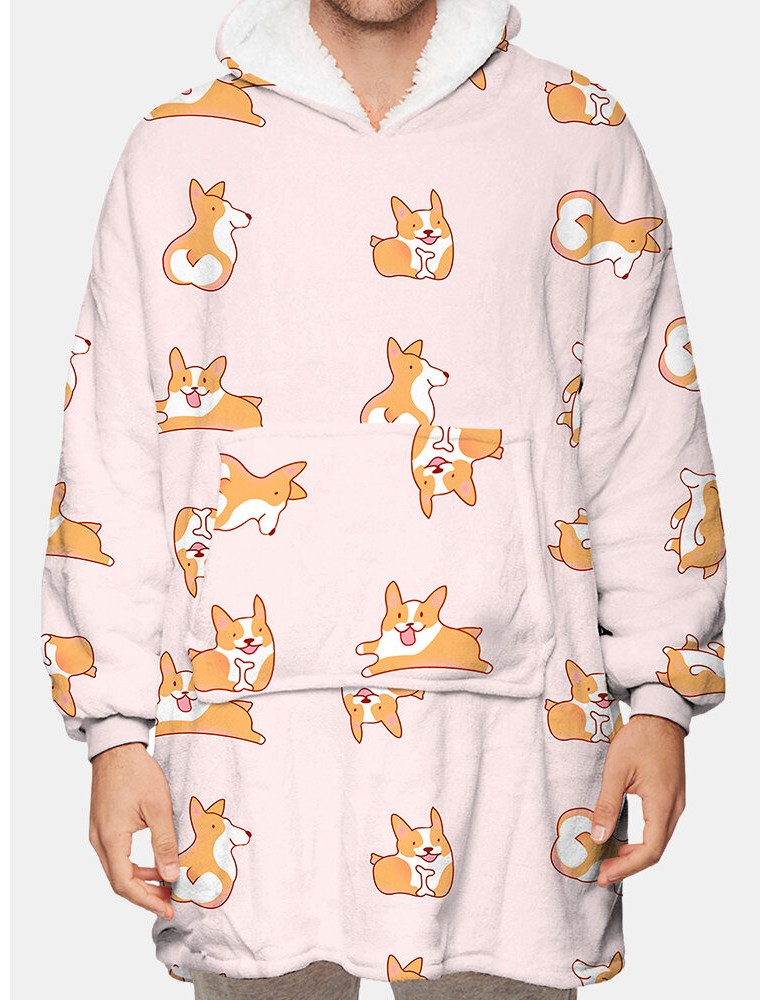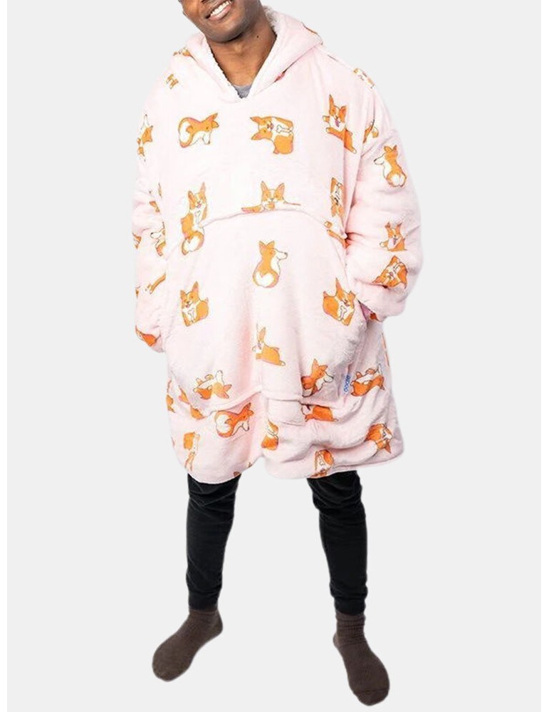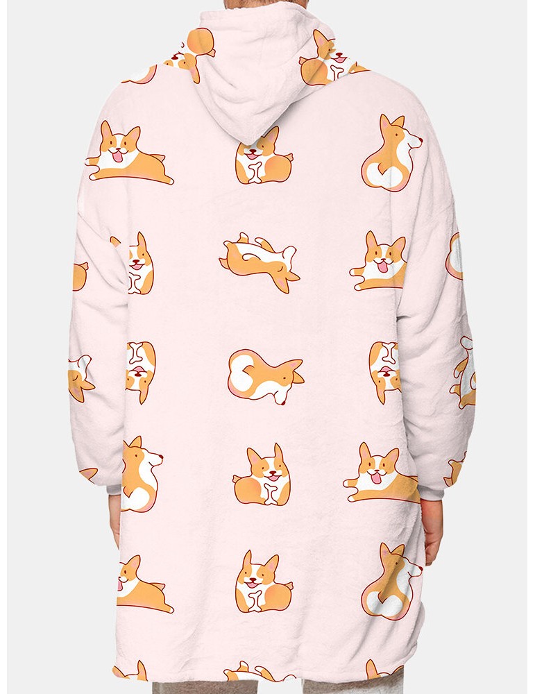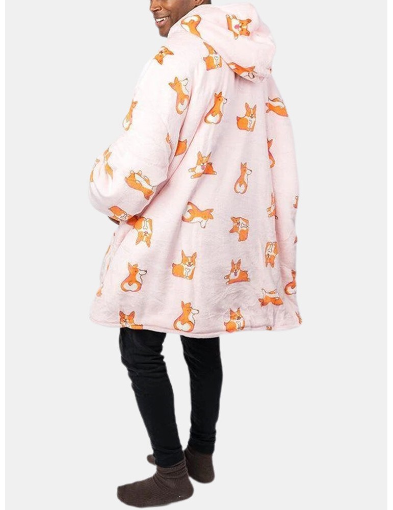 Robes - Mens Dog Print Fleece Two-Sided Wearable Blanket Hoodie Loungewear With Handy Pocket