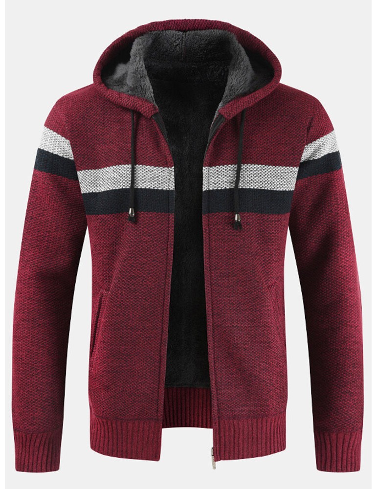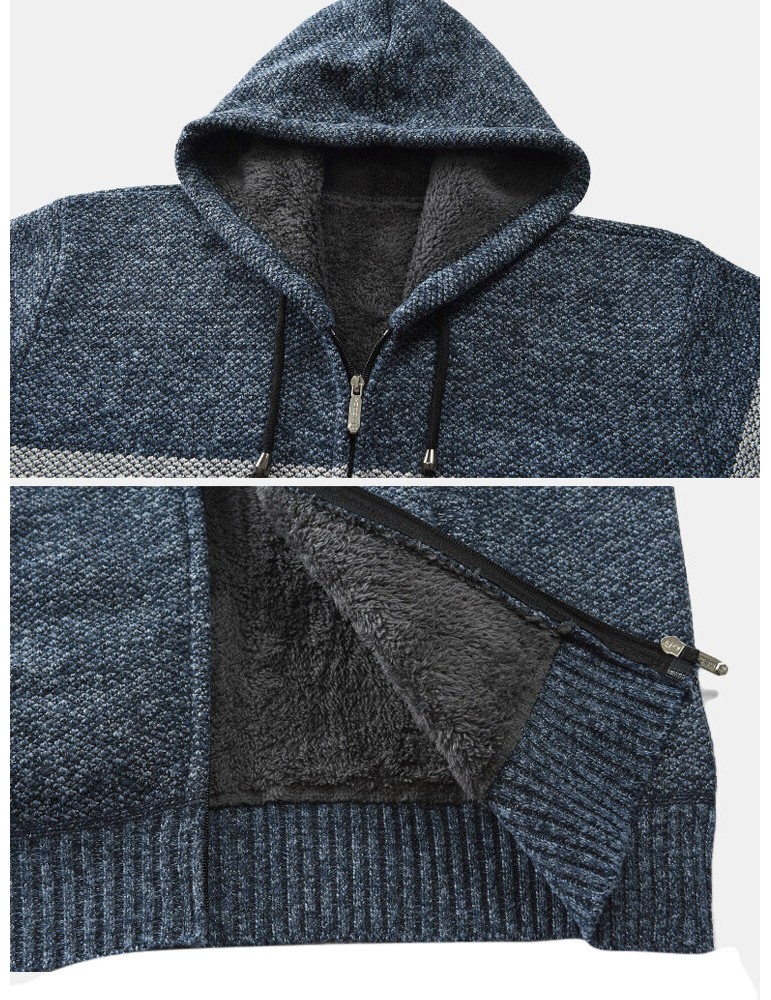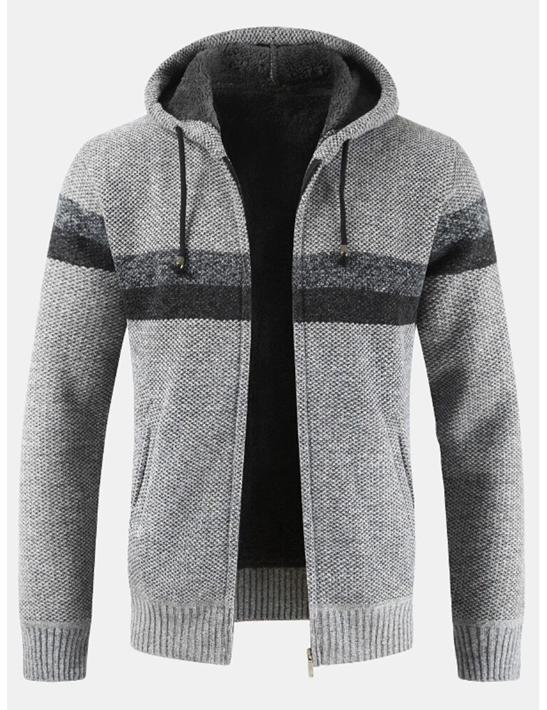 Cardigans - Mens Patchwork Zip Front Rib-Knit Plush Lined Hooded Cardigans With Pocket