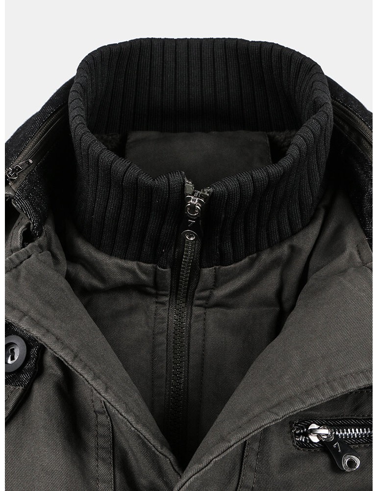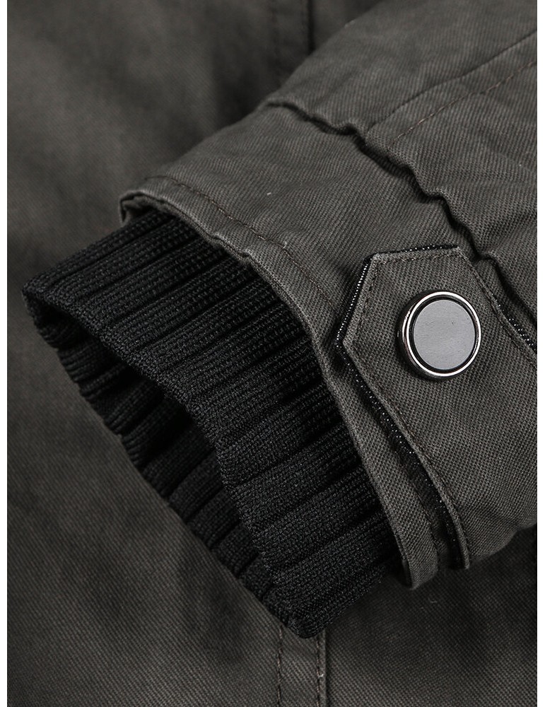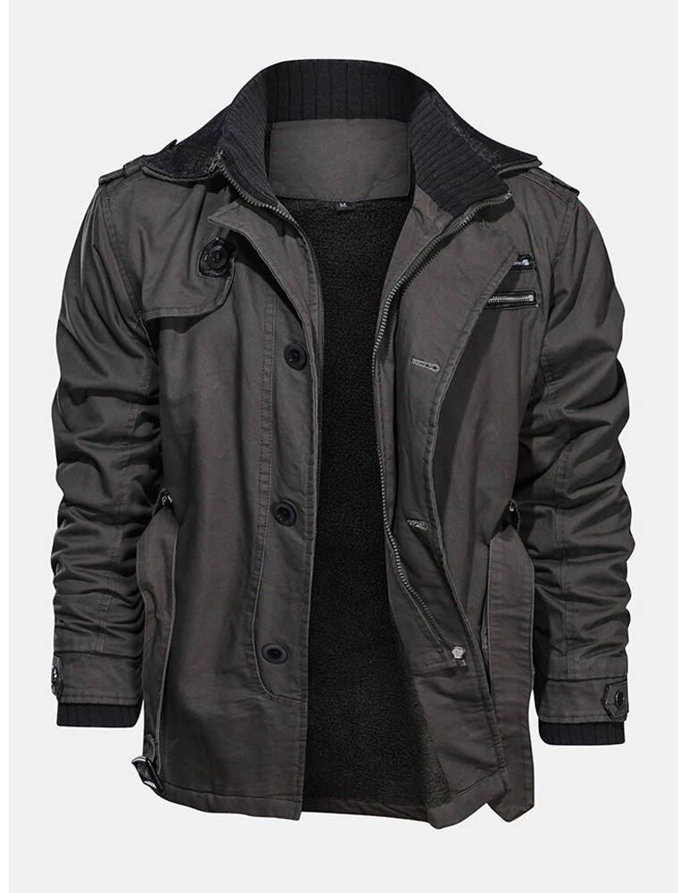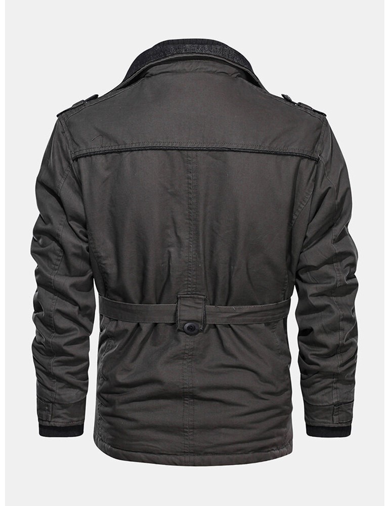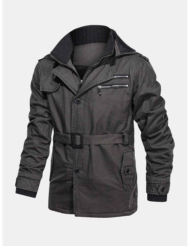 Mens 100% Cotton Fleece Lined Warm Solid Color Cargo Coats With Belt