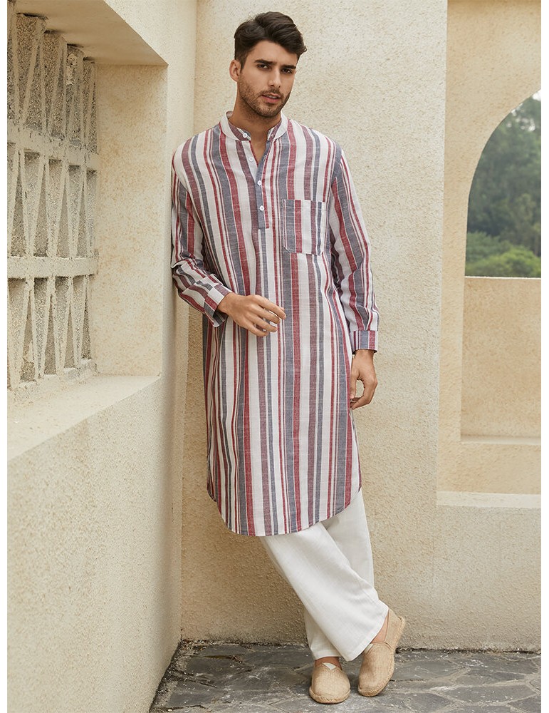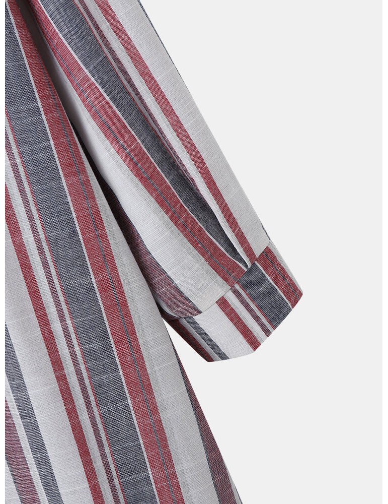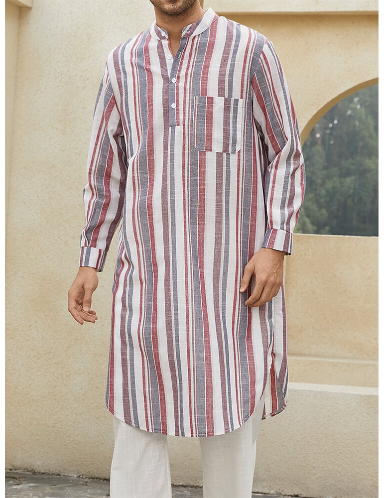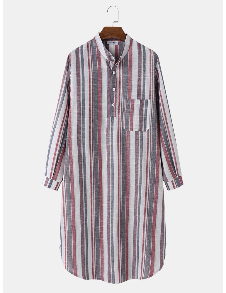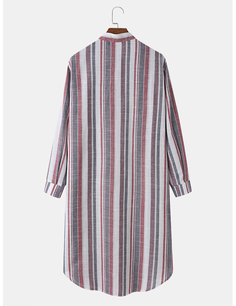 Robes - Men Striped Chest Pocket High Low Hem Casual Night Robe