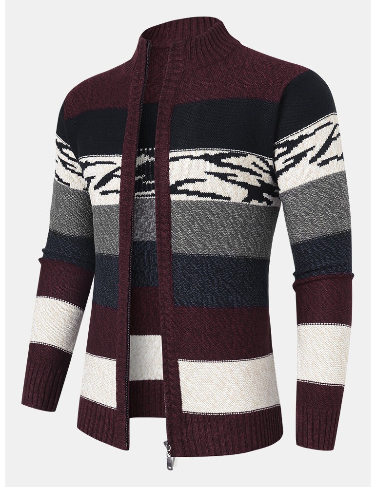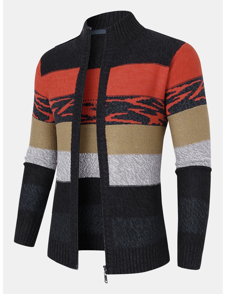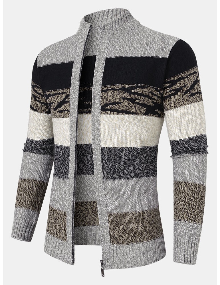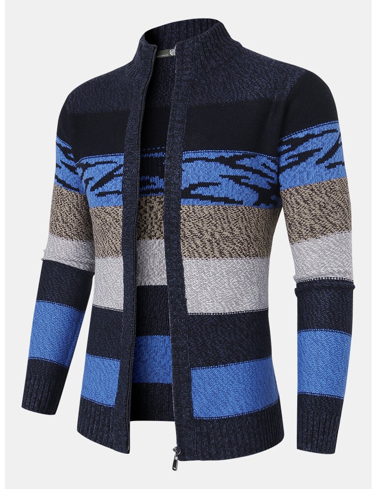 Cardigans - Men Striped Color Block Zipper Stand Collar Casual Cardigans