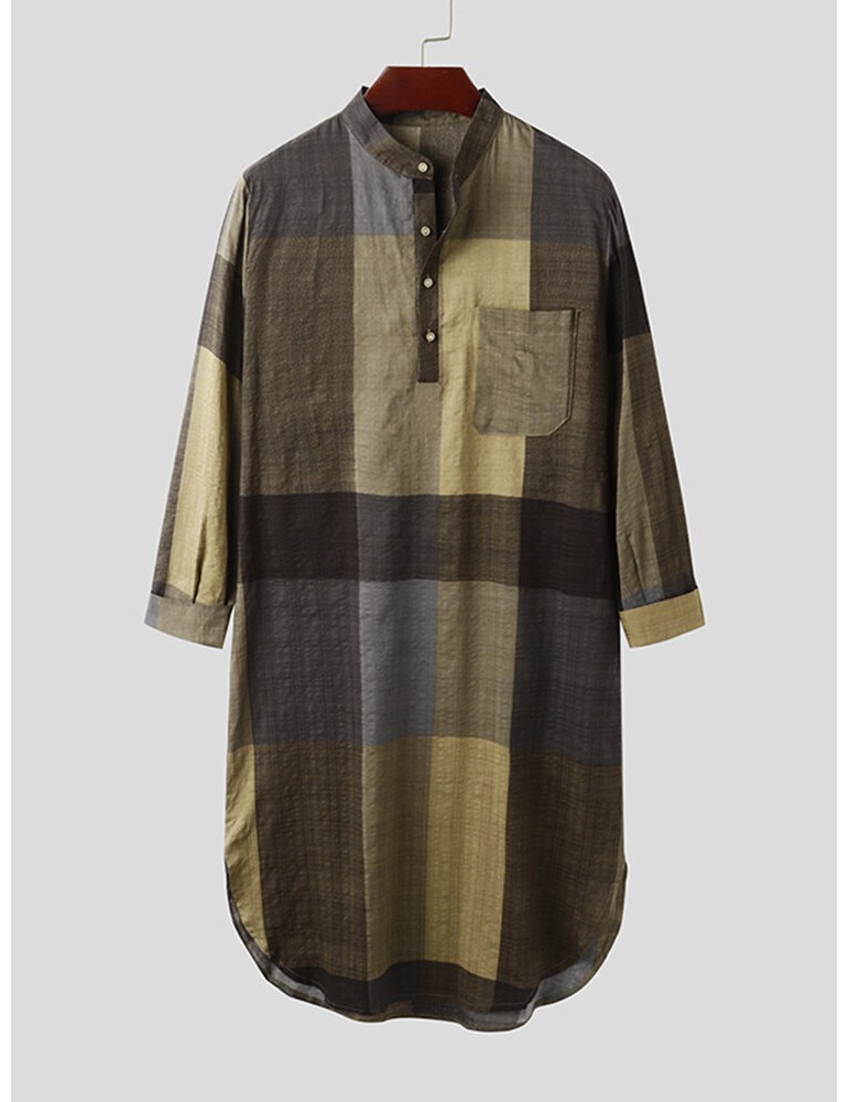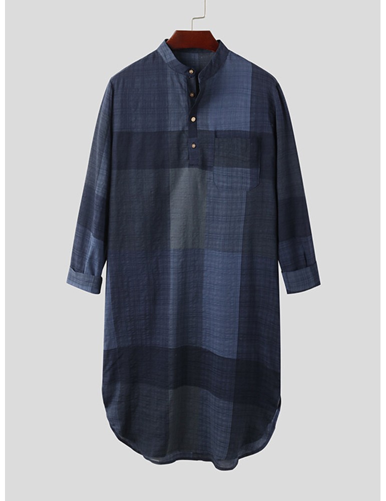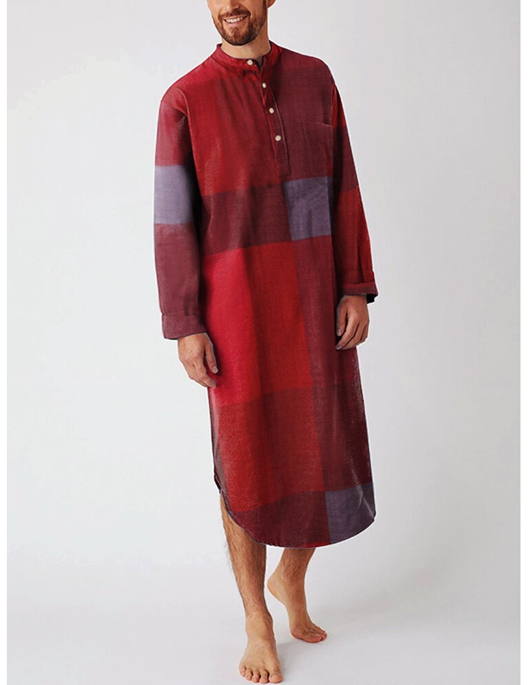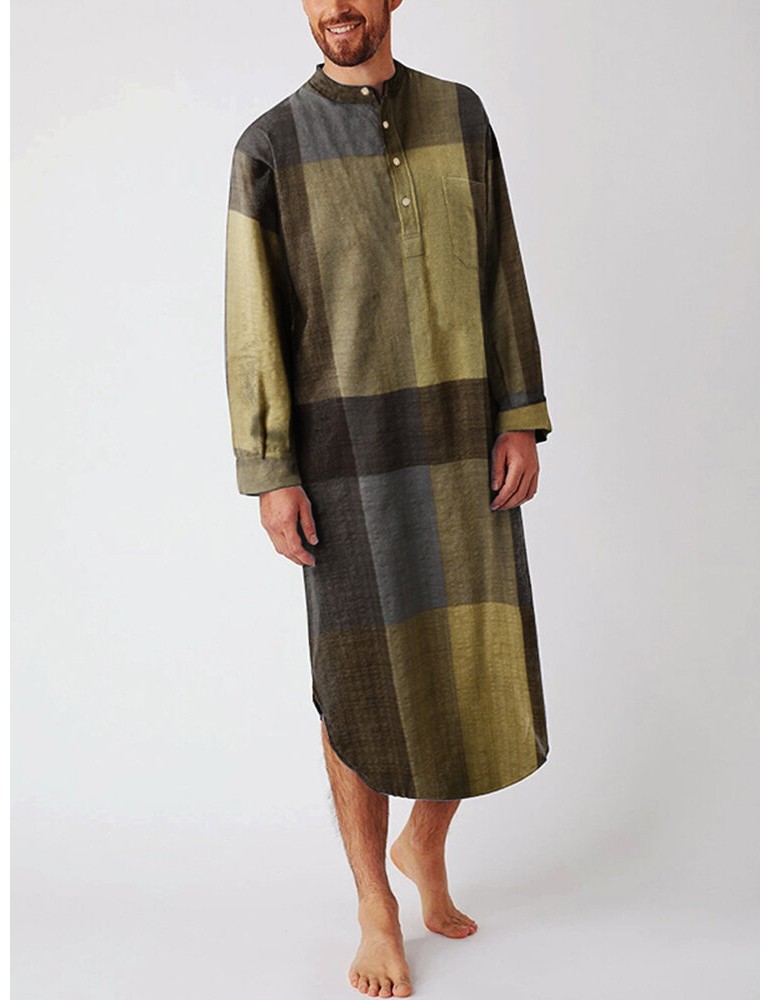 Robes - Mens Cotton Plaid Print Henley Shirts Home Sleepwear Long Sleeve Robes With Pocket