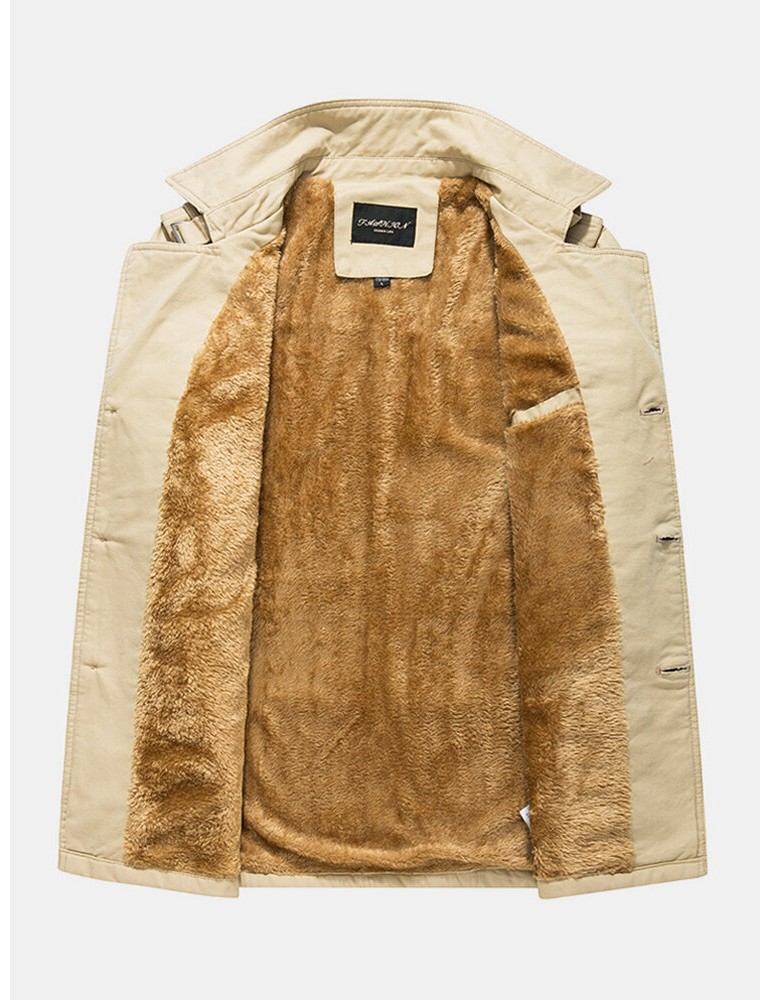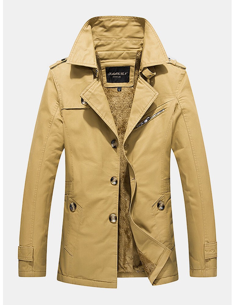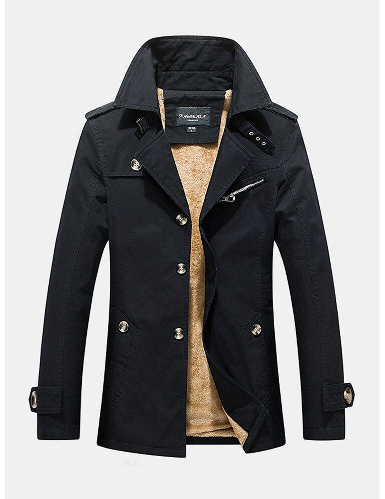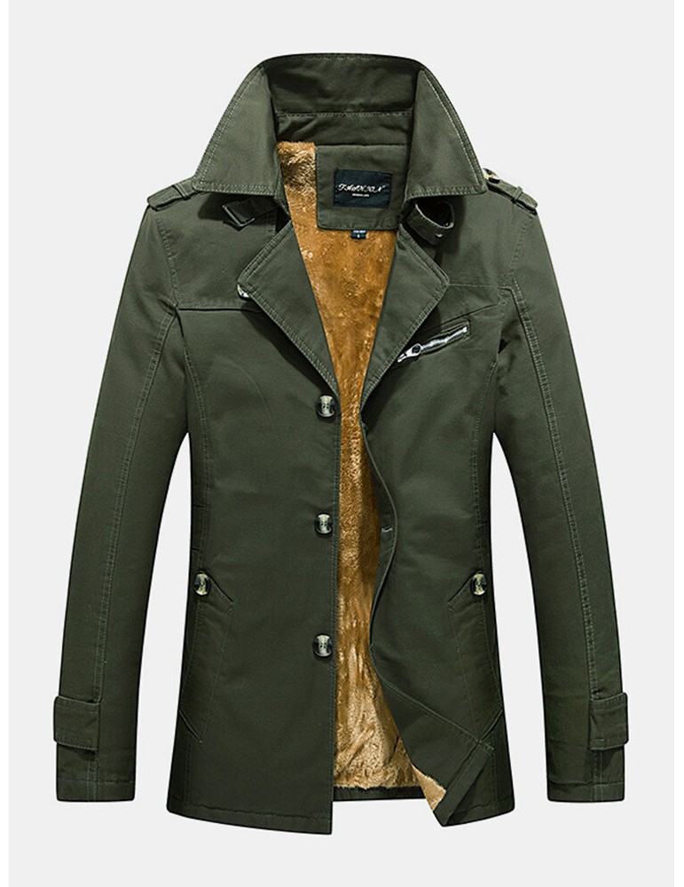 Coats - Mens Cotton Thick Plush Lined Button Front Lapel Warm Coats With Pocket